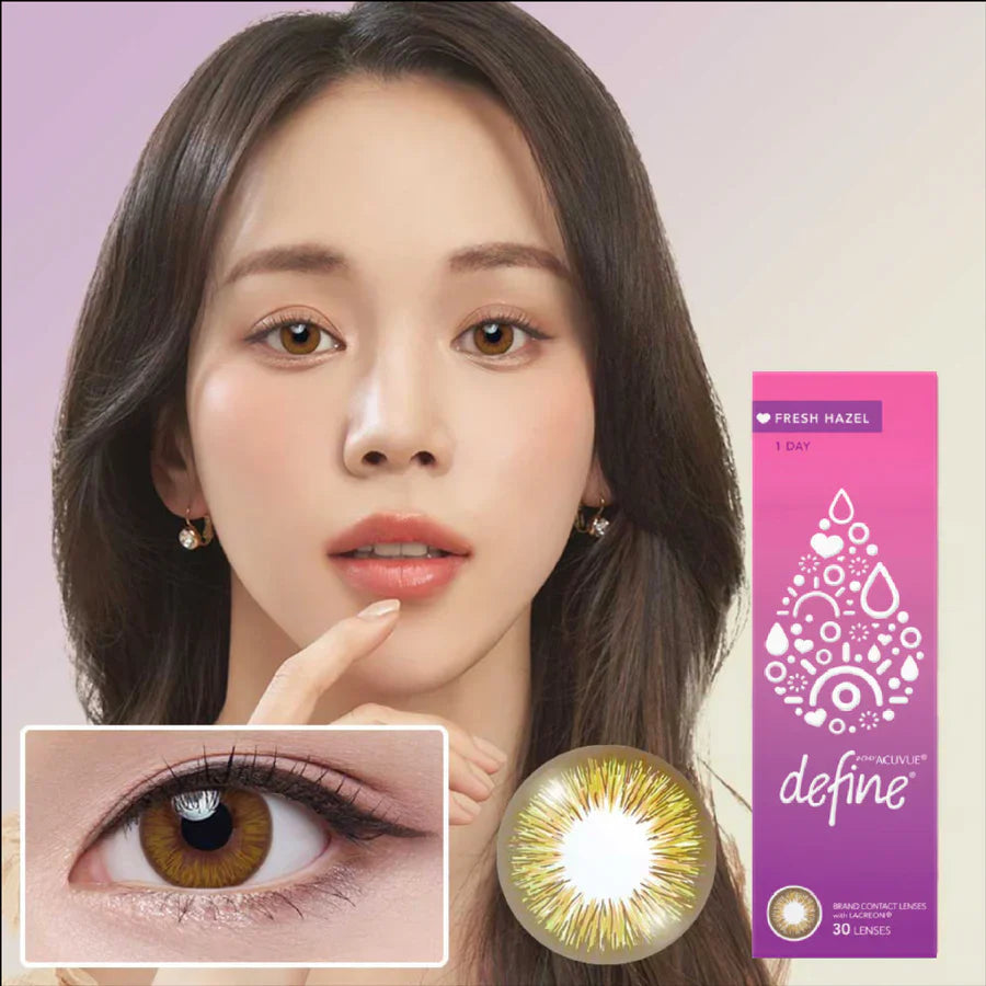 The 1-Day Acuvue Define Fresh Hazel lenses combine aesthetic enhancement with cutting-edge comfort and safety features. Their nature-inspired hazel design enhances the iris with a vibrant, multi-layered look, while LACREON® Technology ensures long-lasting moisture and comfort. UV protection and Beauty-Wrapped-in-Comfort™ Technology add safety, and the daily disposable format offers convenience and hygiene. These lenses are particularly appealing for those seeking a natural yet striking eye color change with minimal maintenance.