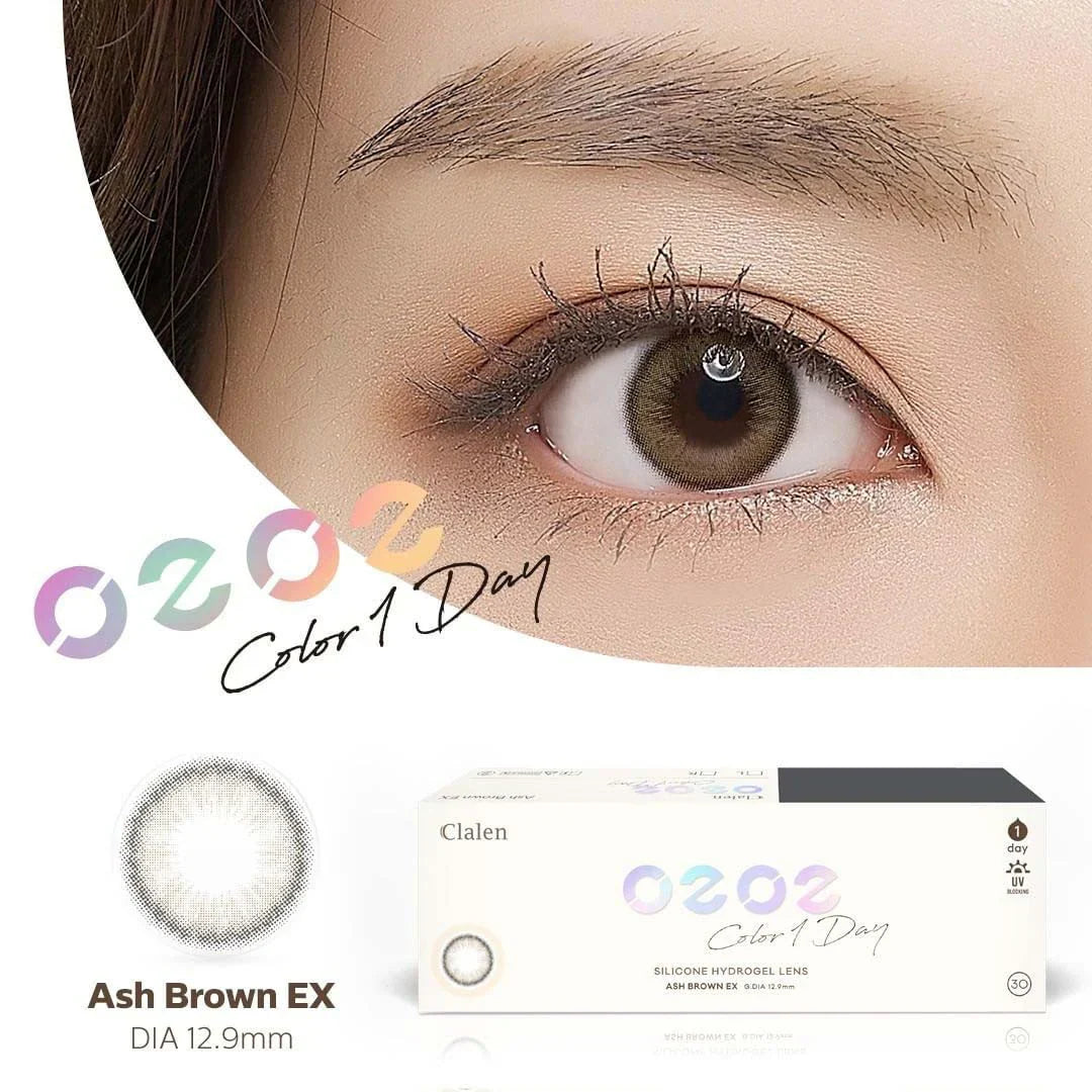 Enhance your vision with Clalen O2O2 Color 1-Day Toric Ash Brown EX. These 30-pack daily disposables correct astigmatism with a toric stabilization design, feature a 12.9 mm colored diameter and layered ash brown tones for subtle enlargement, plus breathable silicone hydrogel (45% water, 130 Dk/t) and UV blocking.