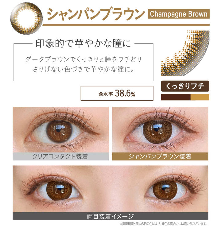 A defined dark-brown ring paired with a champagne-beige inner blend and fine dots. The 13.8 mm graphic brightens and enlarges while keeping a seamless, natural rim.