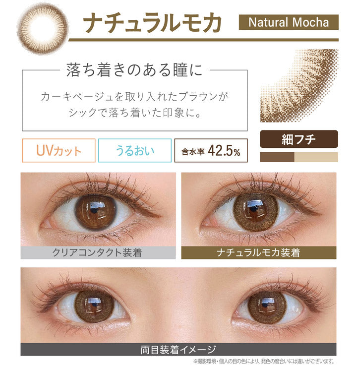 Khaki‑beige infused brown with a softly defined ring adds calm depth and brightness. The 13.8 mm graphic enlarges gently for a chic, natural gaze.