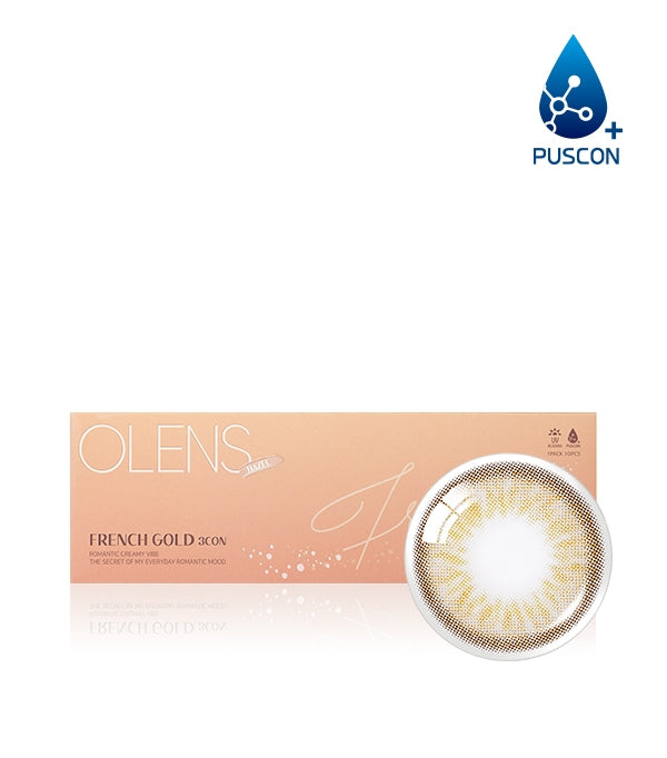 The OLENS 1 Day French Gold 3con Hazel lenses deliver a refined and natural enhancement through thoughtful design. Crafted with Puscon for excellent moisture retention and featuring 48% water content, they prioritize comfort. Their 13.1 mm graphic diameter, nestled within a 14.2mm outer diameter, ensures a subtle but effective enlargement, matching close to your natural pupil size for a seamless look. The creamy edge line softens the iris border for a gentle, luminous effect. With its warm hazel tones and faint golden ring, the lens complements everyday makeup beautifully. These daily disposables blend elegance with practicality, offering a naturally captivating glance.