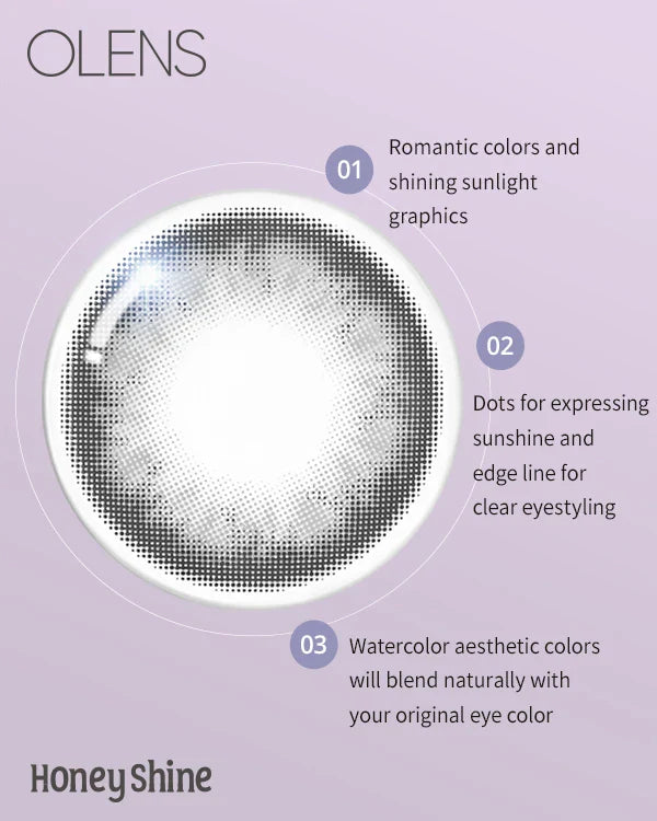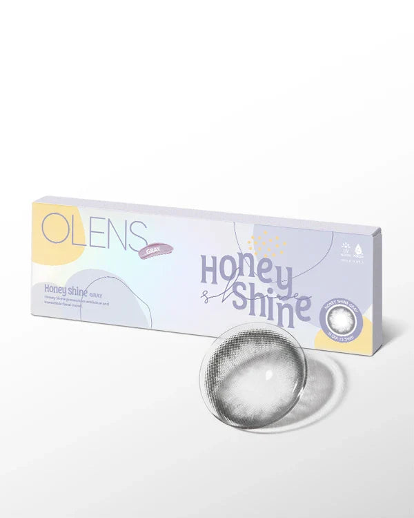 The OLENS 1 Day Honey Shine Gray lens beautifully balances everyday comfort with an understated, stylish look. Crafted from Puscon with 48% water content, the material promotes breathability and moisture retention-essential for all-day comfort. The lens design emphasizes elegance: a moderate graphic diameter (13.5 mm) combined with a 14.2 mm diameter offers natural enlargement, while the gray hue—with ash-black and creamy undertones—enhances the eyes subtly. Its dotted sunlight-inspired pattern and defining edge bring a romantic, radiant effect without overpowering, making it both refined and refreshing.