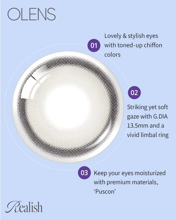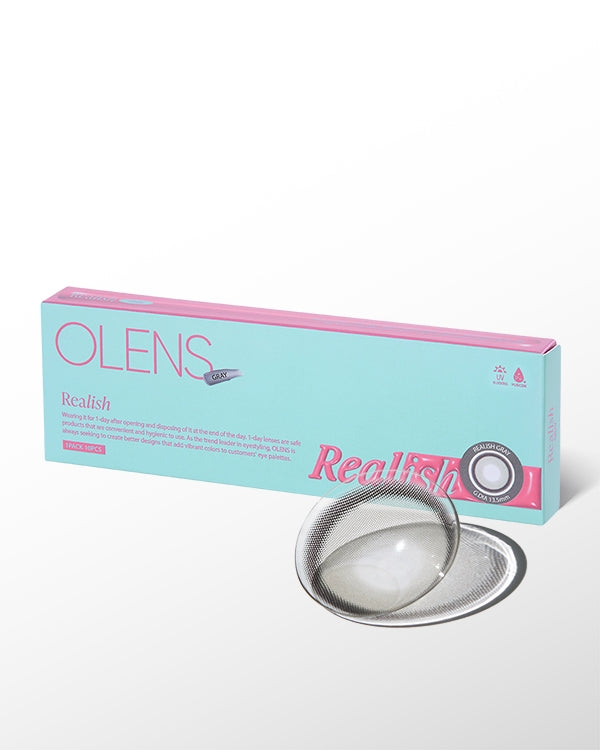 Realish 1Day Gray features a two-zone design: a soft central chiffon-gray tone transitions into a sharp dark limbal ring within a 13.5 mm graphic diameter (14.5 mm D.I.A). This balanced gradient frames the iris, capturing and reflecting light to sculpt subtle depth and natural enlargement.