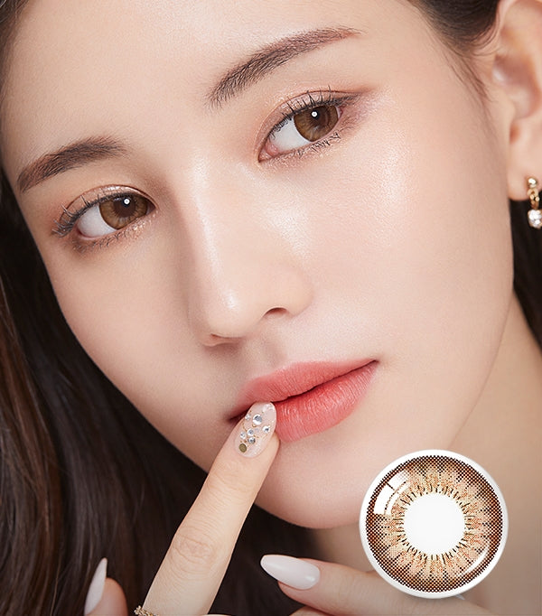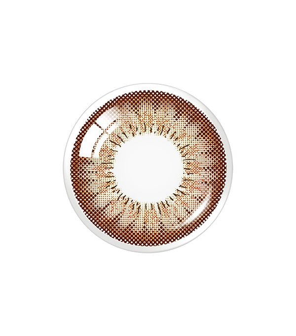 OLENS Chandelier Brown lenses combine breathable silicone hydrogel and 38% hydration with a glamorous golden-brown chandelier pattern for naturally enhanced depth. Their optimized dimensions ensure a comfortable fit, and with options from plano to –10.00 and a six-month lifespan, they deliver both style and lasting wearability.