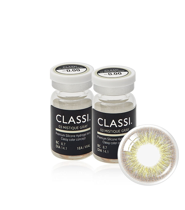 Classi Mistique Gray balances a calm charcoal edge line with a cool gray base and a subtle beige‑gold inner halo for glossy, natural definition. The medium 13.5 mm graphic diameter adds noticeable yet refined enlargement, while a translucent center and micro‑dot gradient melt into dark irises, clean depth without a harsh limbal ring.