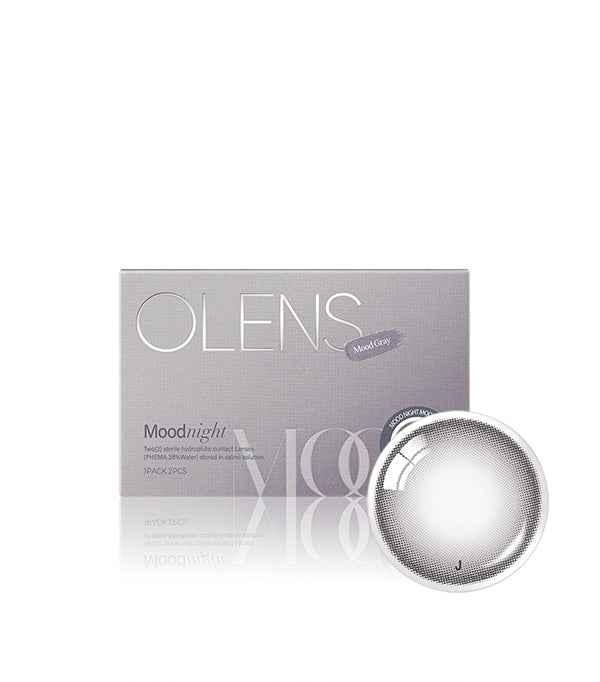 Olens Mood Night Mood Gray Toric marries precise astigmatism correction and a calming smoky-gray aesthetic with breathable 40% water-content hydrogel comfort, subtle enlarging definition, and a flexible monthly-disposable format for confident vision all month long.