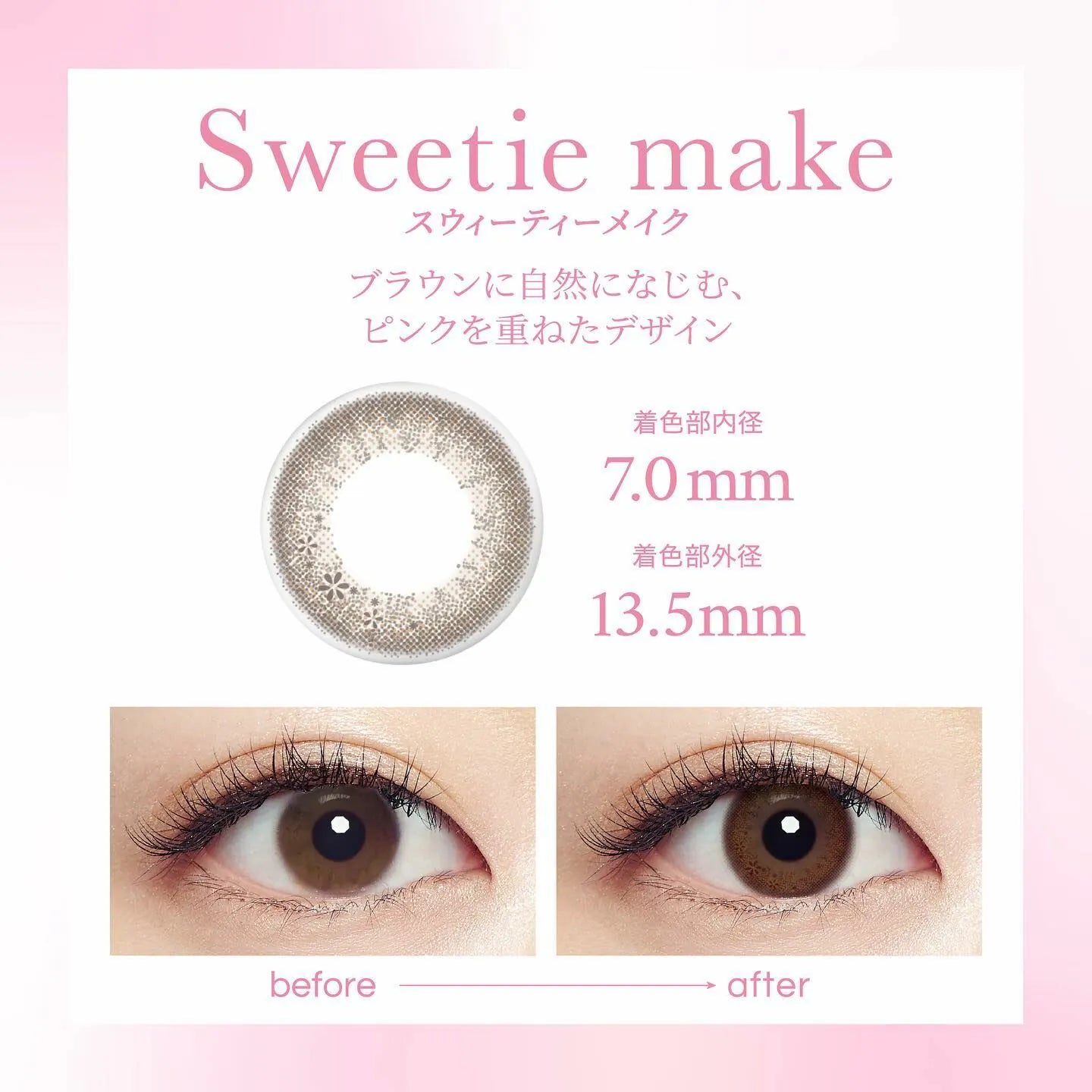 Soft brown ring with a pink nuance; 13.5 mm design gives sweet, glossy enlargement while keeping the pupil natural.